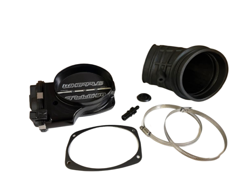 This is a Whipple Throttle Body upgrade kit for the 2018-2023 Ford Mustang 5.0L Supercharger Kit. The throttle body kit comes with the throttle body, plastic 123mm round to 132mm elliptical air tube and silicone hose to fit to a 2018-2023 Mustang with a Whipple 3.0L installed and Whipple airbox.
