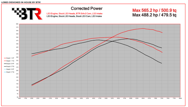 The V2 Stage 4 LS3 grind has been utilized on many max effort combinations with great success. We see 500+ whp with the addition of proper bolt-ons, while maintaining the durability you come to expect from BTR components. It is ground with nitrous in mind as well, working well with up to 300 horsepower worth of night night juice. For proper piston-to-valve clearance, you cannot mill your cylinder heads without the possibility of needing to flycut your pistons. An aftermarket converter is a necessity for automatic applications.