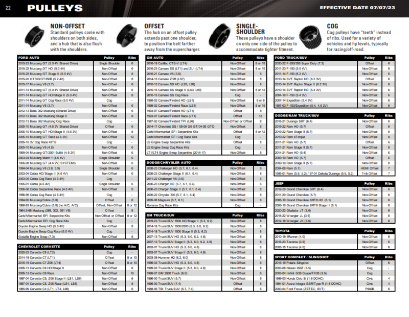 Important Information: ProCharger pulleys are available in three different variations depending on the vehicle’s make, model, and year. These variations include non-offset pulleys, offset pulleys, and single-shoulder pulleys.