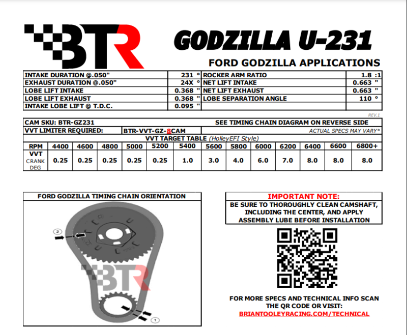 Note: To take advantage of this grind, it is imperative to utilize VVT control and engine tuning. A proper calibration with attention to detail in this respect will make this camshaft SHINE! *See Cam Card for recommended Holley VVT Target Table.*