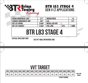 This 217 intake duration cam is BTR's largest recommended offering for a L83 with unmilled cylinder heads. With just simple bolt-ons this grind has made well over 500hp in a stock bottom end application. It's truly a marvel in its ability to perform well in such a mild application. By continuing to utilize the factory VVT system, we were able to set the valve events where we like for stump pulling torque down lown while providing EXPLOSIVE top end power. In this sense, the end user truly has the best of both worlds.