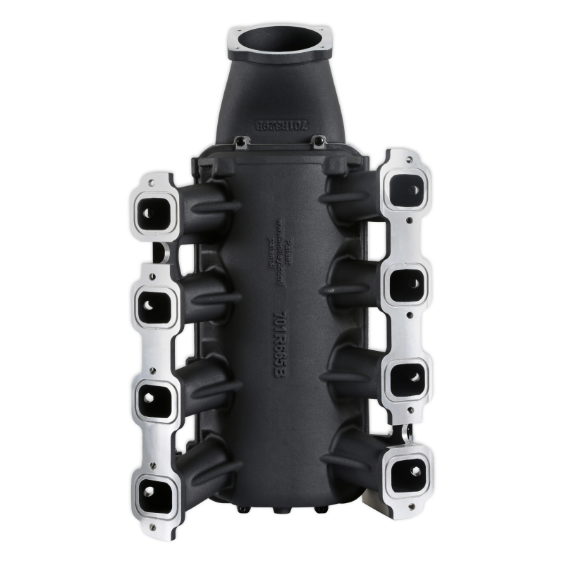 The standard plenum top throttle body flange has a 105 mm opening to work with throttle body part number 112-581 or similar models. The top-feed plenum base intake manifold is designed with a reduced overall height to fit under a stock or mildly modified hood. The Lo-Ram provides a low profile modular intake manifold suitable for use with plenum mounted air-to-water intercoolers for boosted applications. Various Hi-Ram plenum top options are available to compliment the top-feed base intake manifold kits and fabrication flanges are offered to aid the fabrication of plenum tops for custom installations. Available for OE direct fuel injection only and with port fuel injection provisions.