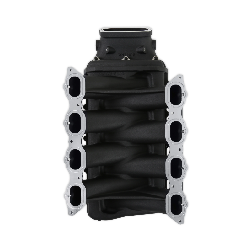 The Ultra Lo-Ram provides an additional 19.4mm front and 42.6mm rear clearance compared to the Ford Performance Cobra Jet manifold, plus clears 2015-2023 Mustang factory hoods. Offered in both round and oval throttle body configurations, with replacement front inlets for easy interchangeability. The oval inlet can accommodate up to a 150x66mm single throttle body.