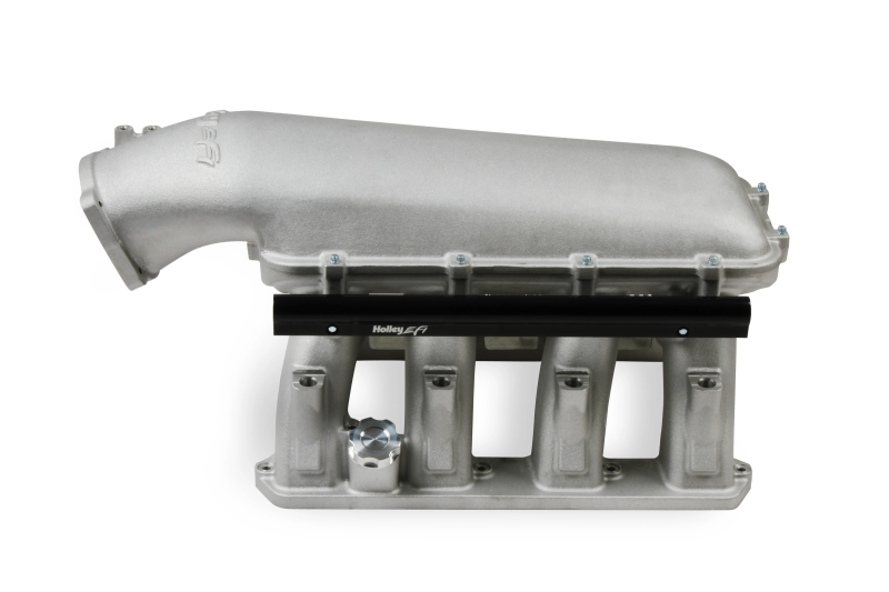 The base is designed to be modular in configuration to accept a wide range of EFI tops and to be attractive to builders and fabricators as the foundation for custom induction systems. Runner length and the tapered cross-section designed to perform well for a wide range of engine configurations. The EFI fuel rails are machined for -8AN O-ring fittings with passages large enough to accommodate high fuel flow and dampen pressure pulsations in the fuel system and come standard with EFI Hi-Ram kits. Intended for use on naturally aspirated, forced induction, or nitrous engines in the 5.7 to 7.2+ liter range, max power at 7500-8500 RPM.