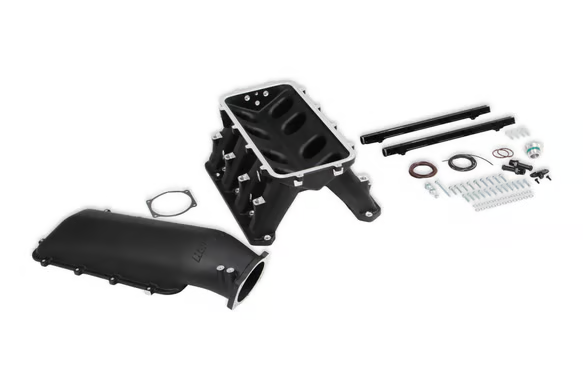 The base is designed to be modular in configuration to accept a wide range of EFI tops and to be attractive to builders and fabricators as the foundation for custom induction systems. Runner length and the tapered cross-section designed to perform well for a wide range of engine configurations. The EFI fuel rails are machined for -8AN O-ring fittings with passages large enough to accommodate high fuel flow and dampen pressure pulsations in the fuel system and come standard with EFI Hi-Ram kits. Intended for use on naturally aspirated, forced induction, or nitrous engines in the 5.7 to 7.2+ liter range, max power at 7500-8500 RPM.