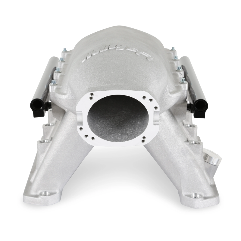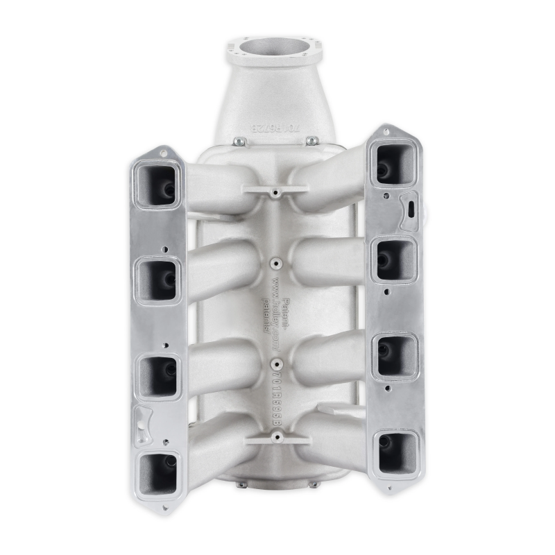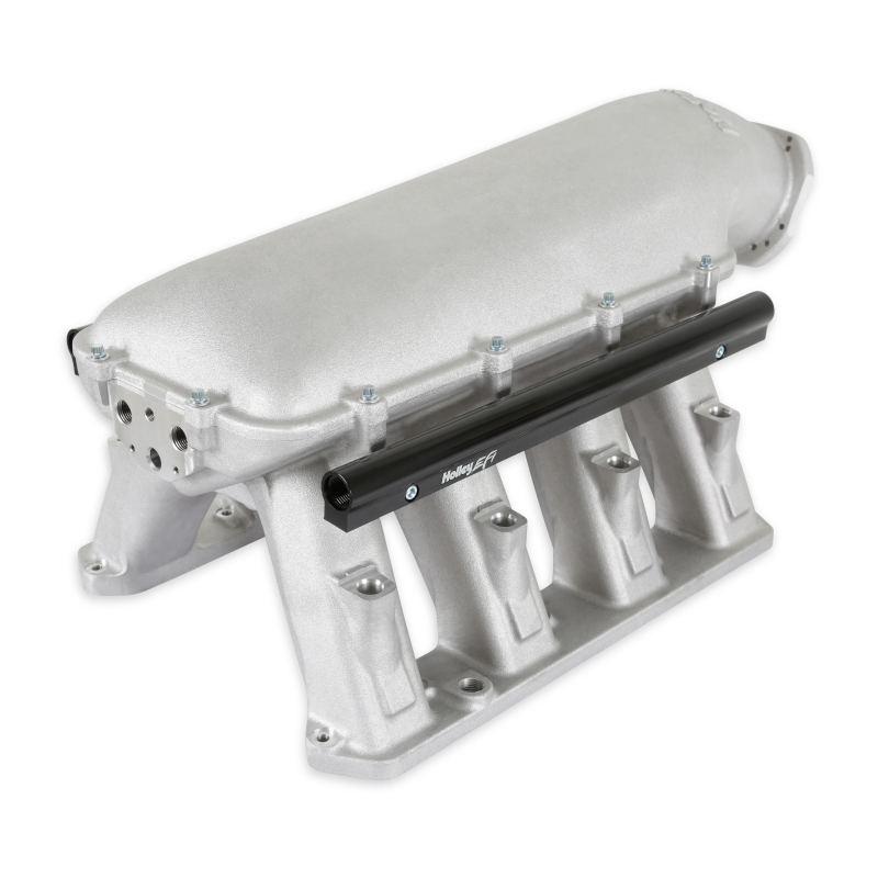 The base is designed to be modular in configuration to accept a wide range of EFI tops and to be attractive to builders and fabricators as the foundation for custom induction systems. Runner length and the tapered cross-section designed to perform well for a wide range of engine configurations. The EFI fuel rails are machined for -8AN O-ring fittings with passages large enough to accommodate high fuel flow and dampen pressure pulsations in the fuel system and come standard with EFI Hi-Ram kits. Intended for use on naturally aspirated, forced induction, or nitrous engines in the 5.7 to 7.2+ liter range, max power at 7500-8500 RPM.