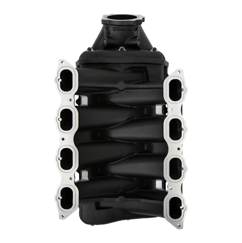 The 300-915/BK simplifies the fabrication of inlet piping which is more simply mated to a round throttle body. In combination with the Hi-Ram top-feed plenum flange which accepts plenum mounted intercoolers, 300-915/BK may become the favored Coyote Hi-Ram for forced induction engine builds.