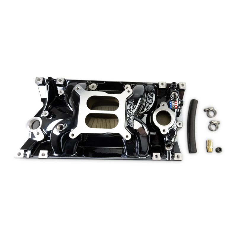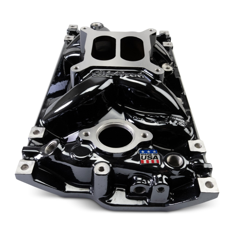 Match with a dependable Edelbrock square-bore carburetor for maximum performance gains. The PN 2716-BP version comes with a beautiful reflective Black Plasma finish that is durable and easy to maintain. The Plasma finishes are applied by a fully automated 7 stage prewash and 4 stage finish. A durable clear powder coat finishes the process.