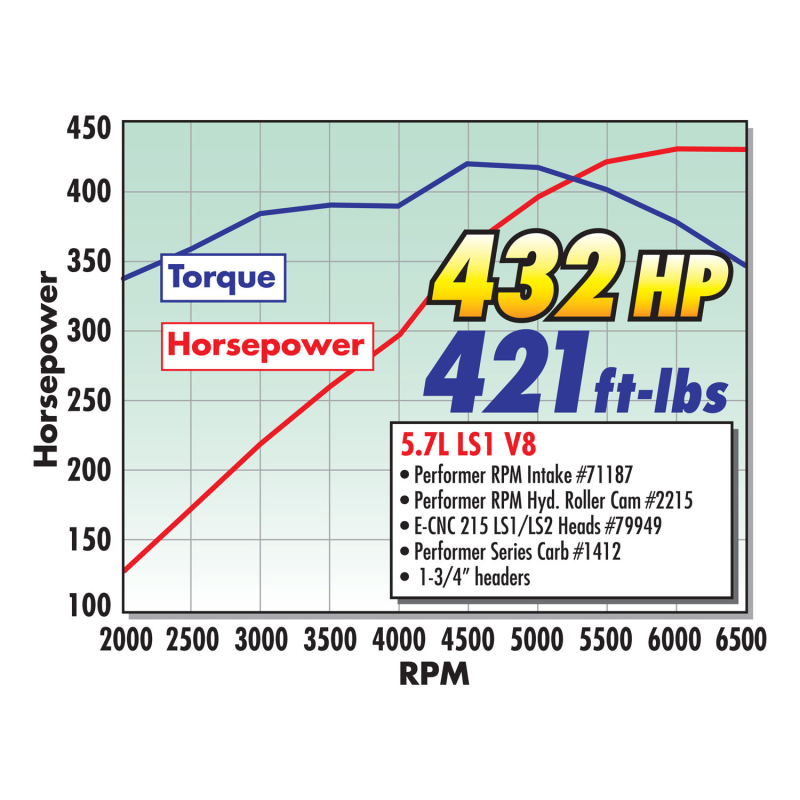 *Must use with high stall torque converter only.. This cam produced 430HP and 420 Ft Lbs of Torque when paired with Performer RPM Intake manifold, Thunder Series AVS Carb and E-CNC 215cc cylinder heads.