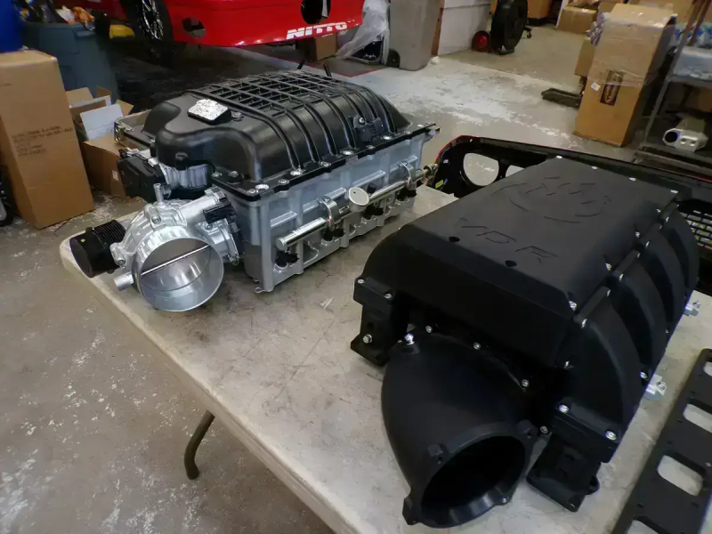 This system compounds boost by making the twin turbos and factory supercharger support each other. The turbos provide the first stage of boost, which the blower amplifies for a higher total pressure (e.g., 3 psi from the turbos equals about 14 psi at the engine). It delivers supercharger response with turbo adjustability, and can also run as a twin-turbo–only setup using an aftermarket intake.