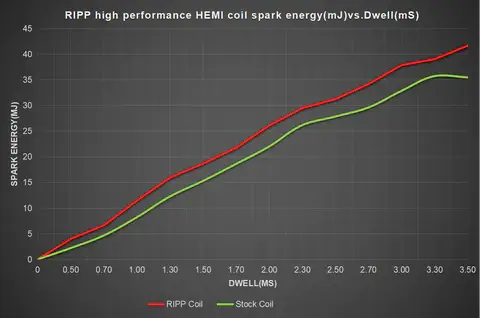 Spark Energy is measured in Millijoules (mj). A Factory coilpack will generate 35.8mj. This mj value is considered low for the cylinder displacement value, piston surface area and air/fuel mixture. A RIPP coilpack will generate 53.6mj. This 17.8mj increase over stock will dramatically increase pressure per square inch across the piston surface. At first start up you'll immediately notice a smoother operating engine, and a "calmer" exhaust tone. This is due to less waste or unburnt hydrocarbons and fuel. Engine response and engine horse power will increase throughout the RPM range.