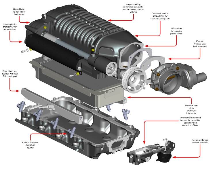 The unique intercooled bypass system offers better acceleration and less than 1hp of consumption during cruising for excellent fuel economy. The system also includes high-flow fuel injectors, aluminum high flow intake manifold and a Whipple Power Flash Programmer from SCT for the factory ECU recalibration. While others claim, Whipple Superchargers simply deliver more power per pound of boost than any other supercharger on the market today.